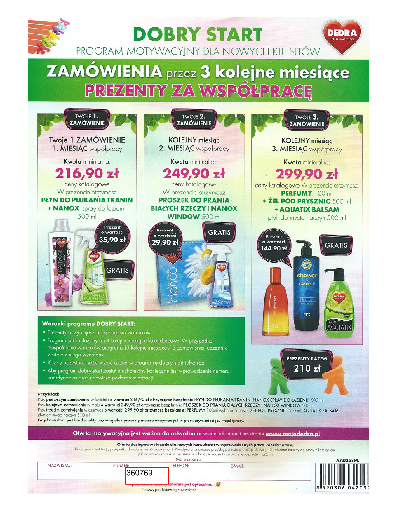 Warunki: Program jest rozłożony na kolejne miesiące kalendarzowe. W przypadku niespełnienia warunków (3 kolejne miesiące / 3 zamówienia) uczestnik zostaje z niego wycofany. Zamówienia mogą być składane częściej, prezenty i tak zostaną przyznane. Każdy uczestnik może wziąć udział w programie tylko raz. Program zostanie uruchomiony tylko w przypadku klientów, którzy wpiszą podczas rejestracji numer koordynatora.